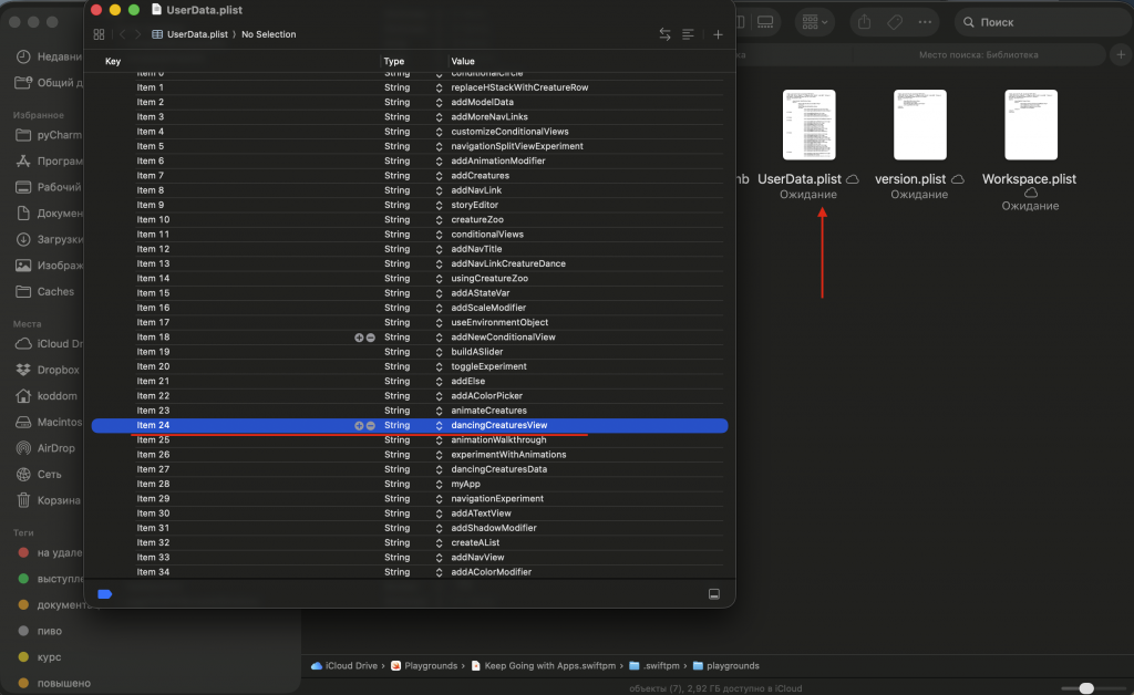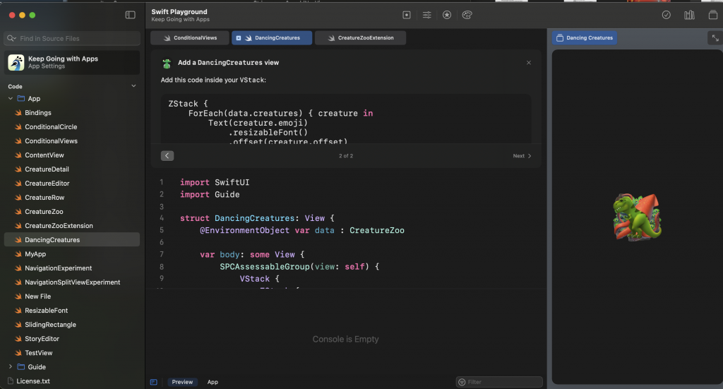 Откройте файл .swiftps > playgrounds > UserData.plist и добавьте в список под именем completedTaskIDs но новый элемент dancingCreaturesView.